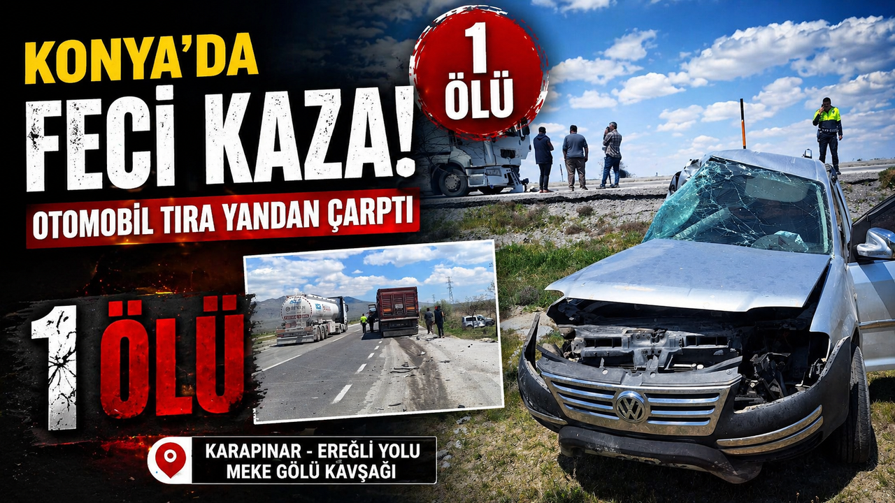 Alınan bilgiye göre, 28 Nisan 2026 günü saat 12.50 sıralarında Karapınar–Ereğli yolu Meke Gölü Kavşağı’nda, O.B. idaresindeki 01 EMF 73 plakalı çekici, kavşaktan ana yola kontrolsüz çıktığı belirtilen 42 AVC 079 plakalı otomobile yandan çarptı.